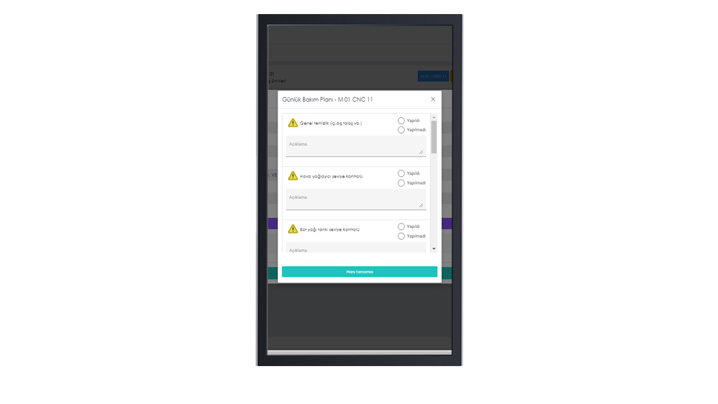 Makina ve iş merkezlerinizin günlük aylık yıllık gibi zamansal ve önleyici bakımlarınızı, makina arızalarını takbini dijitalleştirerek rahatlılla yönetebileceksiniz. arıza ve bakım maliyetlerini sahanızdan anlık alabileceksiniz.